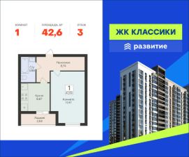 В продаже квартира площадью 42.60 кв. м черновая отделка. Квартира находится в жилом комплексе "Классики", на 3 этаже 16 этажного дома. Застройщик - ГК "Развитие".