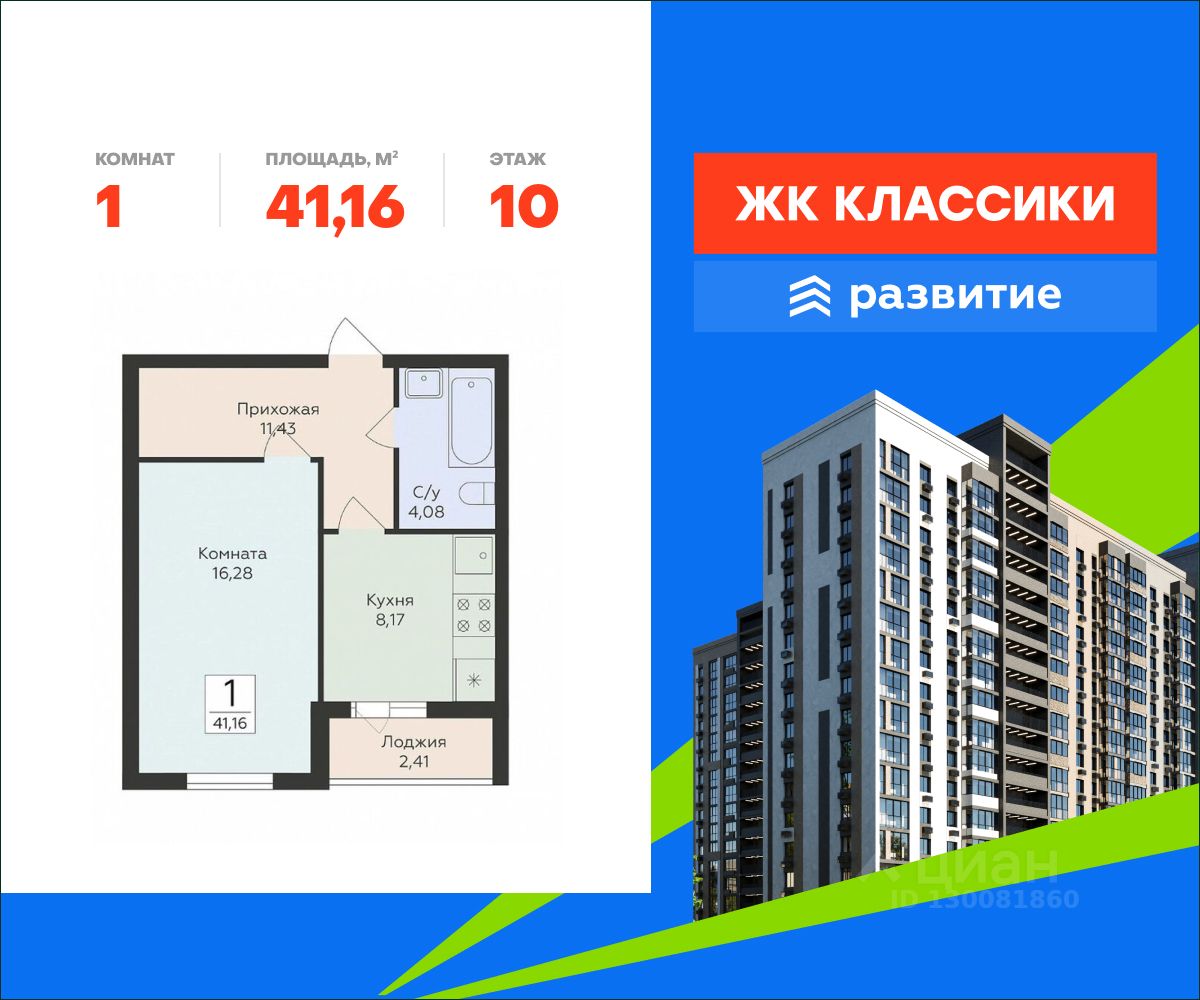 В продаже квартира площадью 41.16 кв. м с черновой отделкой. Квартира находится в жилом комплексе "Классики", на 10 этаже 16 этажного дома. Застройщик - федеральный застройщик ГК "Развитие".