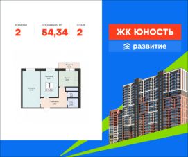 В продаже квартира площадью 54.34 кв. м с черновой отделкой. Квартира находится в жилом комплексе "Юность", на 2 этаже 24 этажного дома. Застройщик - федеральный застройщик ГК "Развитие".