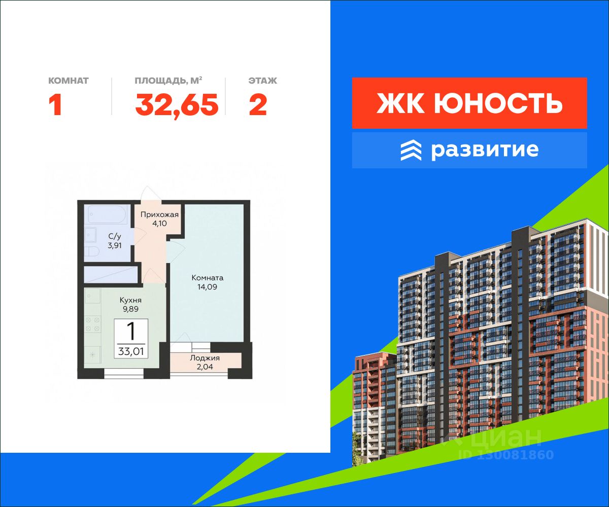 В продаже квартира площадью 32.65 кв. м без отделки. Квартира находится в жилом комплексе "Юность", на 2 этаже 24 этажного дома. Застройщик - ГК "Развитие".
