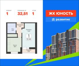 В продаже квартира площадью 32.51 кв. м с черновой отделкой. Квартира находится в жилом комплексе "Юность", на 1 этаже 24 этажного дома. Застройщик - ГК "Развитие".