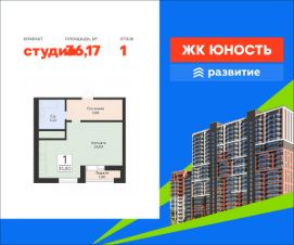 В продаже квартира площадью 36.17 кв. м без отделки. Квартира находится в жилом комплексе "Юность", на 1 этаже 24 этажного дома. Застройщик - ГК "Развитие".