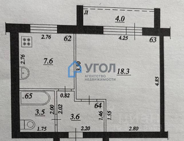 Площадь: 37 кв. м (жилая — 18,3 кв. м, кухня — 7,6 кв. м)