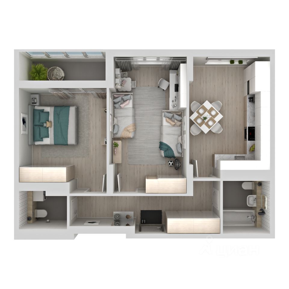 Умная планировка АМГРАД. Эта эргономичная 2-комнатная квартира с функционалом 3-комнатной подойдет для семей с детьми любого возраста. Вам предложены две раздельные жилые комнаты и кухня-гостиная, что позволяет организовать жизнь по собственному сценарию. Детскую можно организовать в любой комнате на ваш выбор, в зависимости от количества детей и их потребностей. Планировкой предусмотрено два санузла, в них достаточно места, чтобы установить стиральную машину и организовать место под хранение вещей. Одна из комнат имеет выход на лоджию с распашными дверями, что дает еще больше света и воздуха в комнате. Это дополнительное функциональное пространство, которое в теплое время года может стать кабинетом, мини-спортзалом, местом для отдыха и сезонного хранения. Начиная с 19-го этажа и выше в квартире увеличенная высота потолков - 2,76 м! Окна квартиры выходят на территорию детского сада.