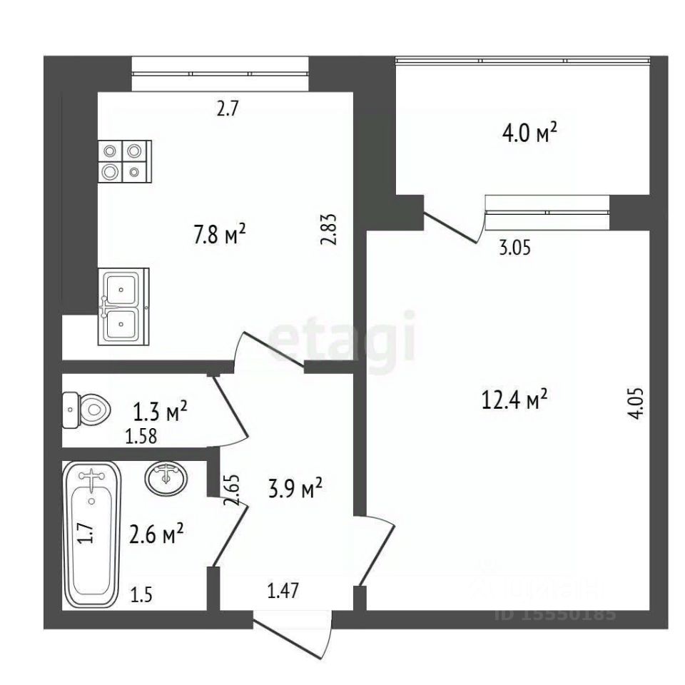 Общая площадь 33 м² включает изолированные комнату, кухню и раздельный санузел.