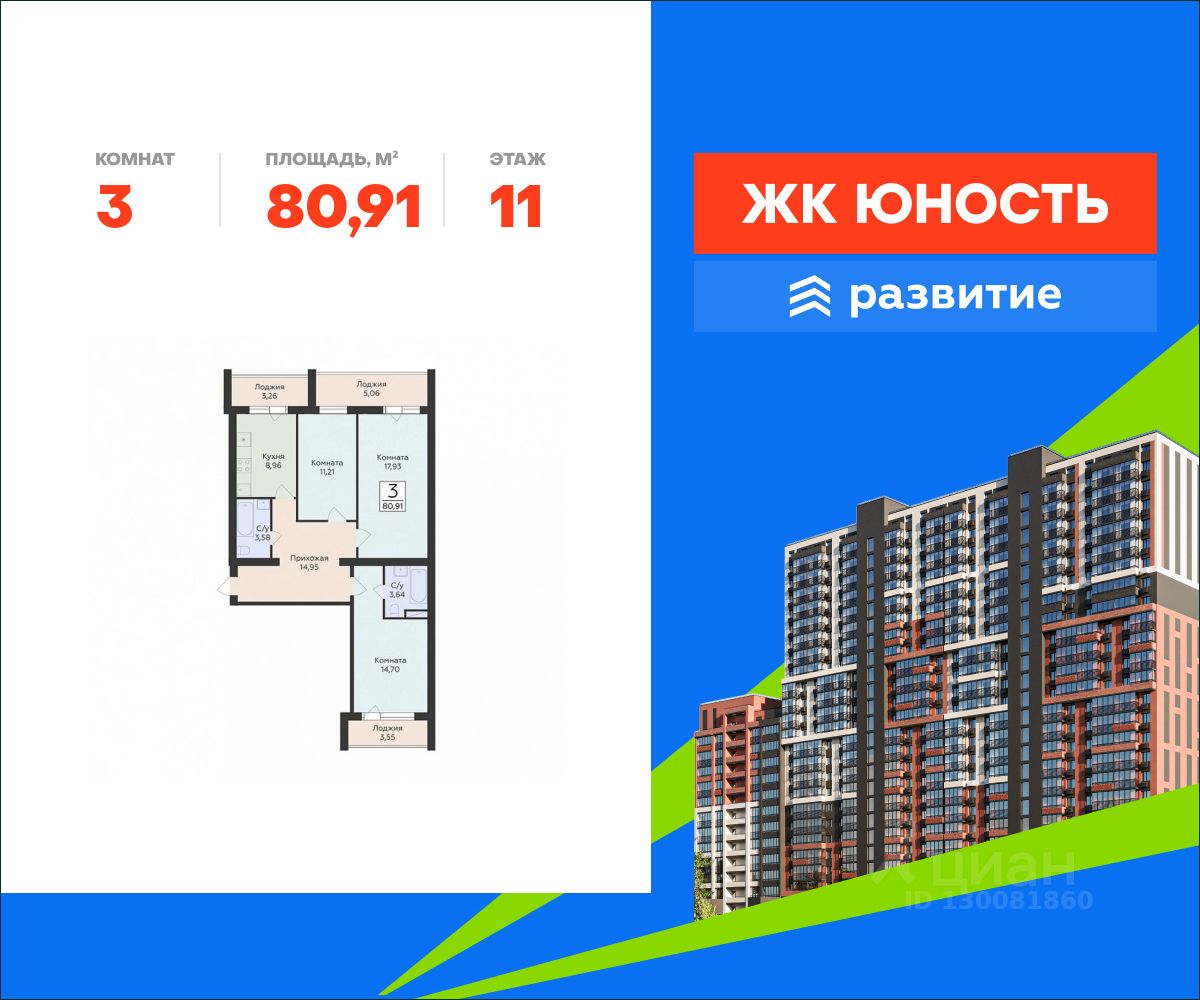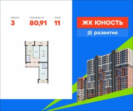 В продаже квартира площадью 80.91 кв. м с черновой отделкой. Квартира находится в жилом комплексе "Юность", на 11 этаже 15 этажного дома. Застройщик - федеральный застройщик ГК "Развитие".