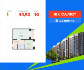 В продаже квартира площадью 44.92 кв. м с черновой отделкой. Квартира находится в жилом комплексе "Салют", на 10 этаже 12 этажного дома. Застройщик - федеральный застройщик ГК "Развитие".