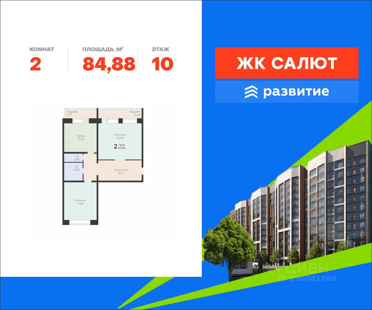В продаже квартира площадью 84.88 кв. м с черновой отделкой. Квартира находится в жилом комплексе "Салют", на 10 этаже 12 этажного дома. Застройщик - федеральный застройщик ГК "Развитие".