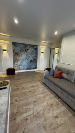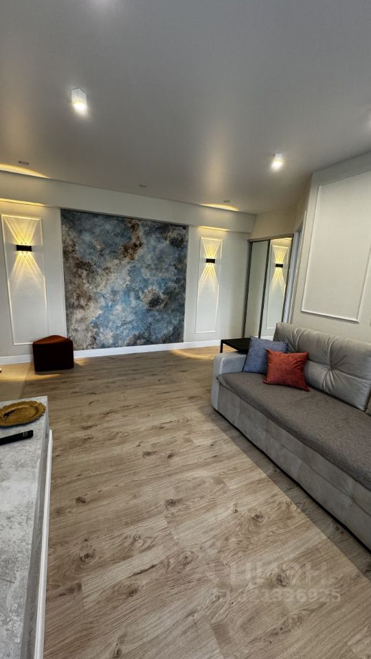 Квартира, оформленная дизайнером, представляет собой гармоничное сочетание лофтового стиля с бетонной штукатуркой и художественной росписи в духе Микеланджело.