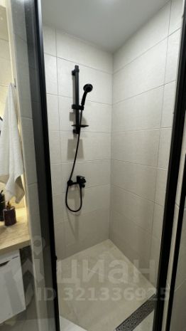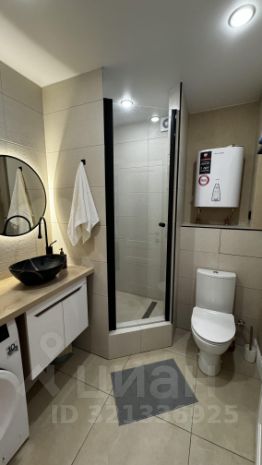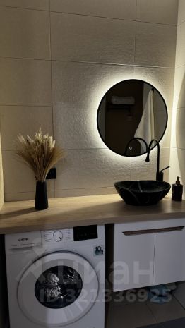 Стильная и функциональная ванная комната с душевой кабиной и совмещённым санузлом. Оснащена всем необходимым: стиральной машиной, водонагревателем, тумбой для хранения и зеркалом с подсветкой.