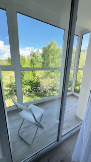 Спальня с двуспальной кроватью и витражными окнами, выходящими на озеленённый двор, обеспечивает отличный настрой с самого утра. В дополнение предусмотрена вместительная гардеробная и дополнительный шкаф для верхней одежды у входа.