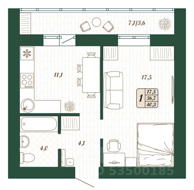 Продаётся 1-комнатная квартира в строящемся доме (Дом 8), срок сдачи: IV-кв. 2026, общей площадью 36.7 кв.м., на 7 этаже.