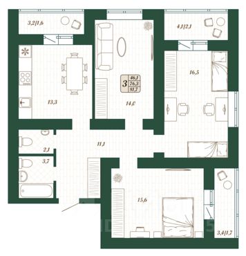 Продаётся 3-комнатная квартира в строящемся доме (Дом 8), срок сдачи: IV-кв. 2026, общей площадью 76.3 кв.м., на 12 этаже.
