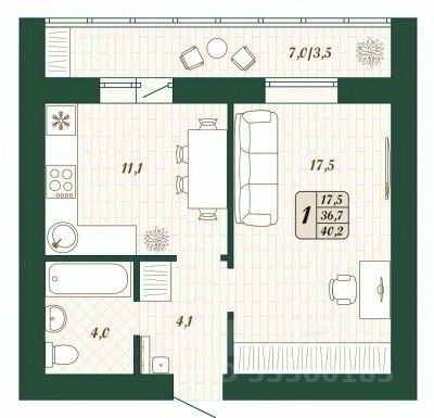 Продаётся 1-комнатная квартира в строящемся доме (Дом 9), срок сдачи: IV-кв. 2026, общей площадью 36.7 кв.м., на 15 этаже.