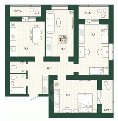 Продаётся 3-комнатная квартира в строящемся доме (Дом 11 ), срок сдачи: IV-кв. 2026, общей площадью 76.3 кв.м., на 13 этаже.