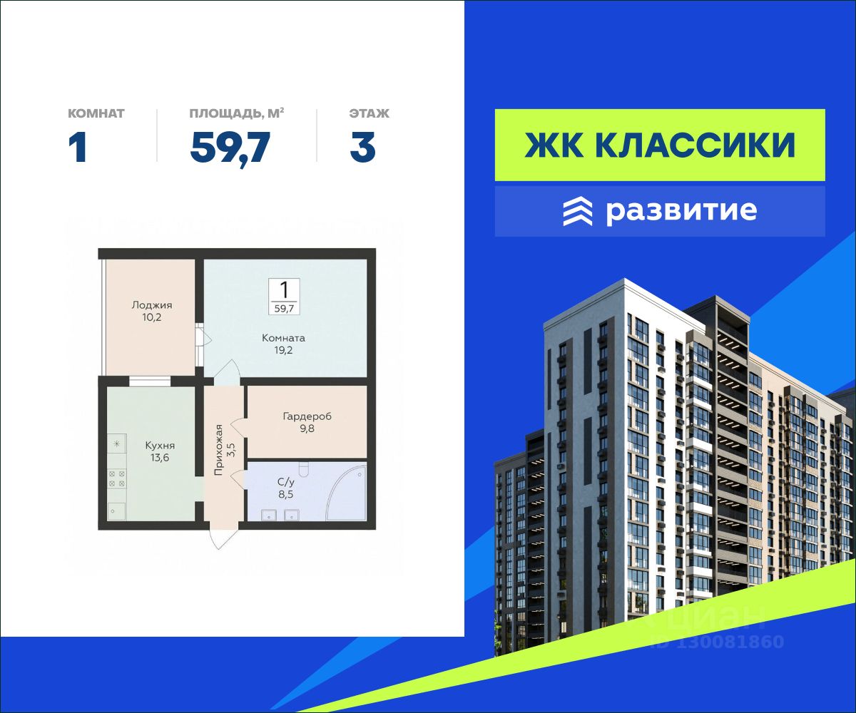 В продаже квартира площадью 59.70 кв. м черновая отделка. Квартира находится в жилом комплексе "Классики", на 3 этаже 16 этажного дома. Застройщик - ГК "Развитие".
