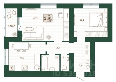 Продаётся 2-комнатная квартира в строящемся доме (Дом 8), срок сдачи: IV-кв. 2026, общей площадью 55.9 кв.м., на 1 этаже.
