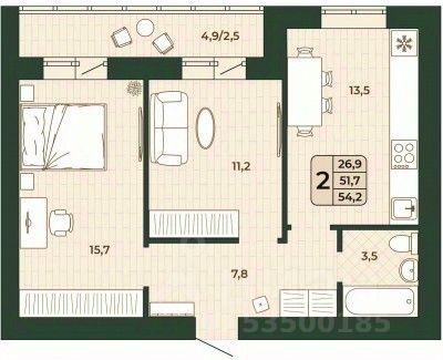 Продаётся 2-комнатная квартира в строящемся доме (дом 5), срок сдачи: IV-кв. 2026, общей площадью 51.7 кв.м., на 7 этаже.