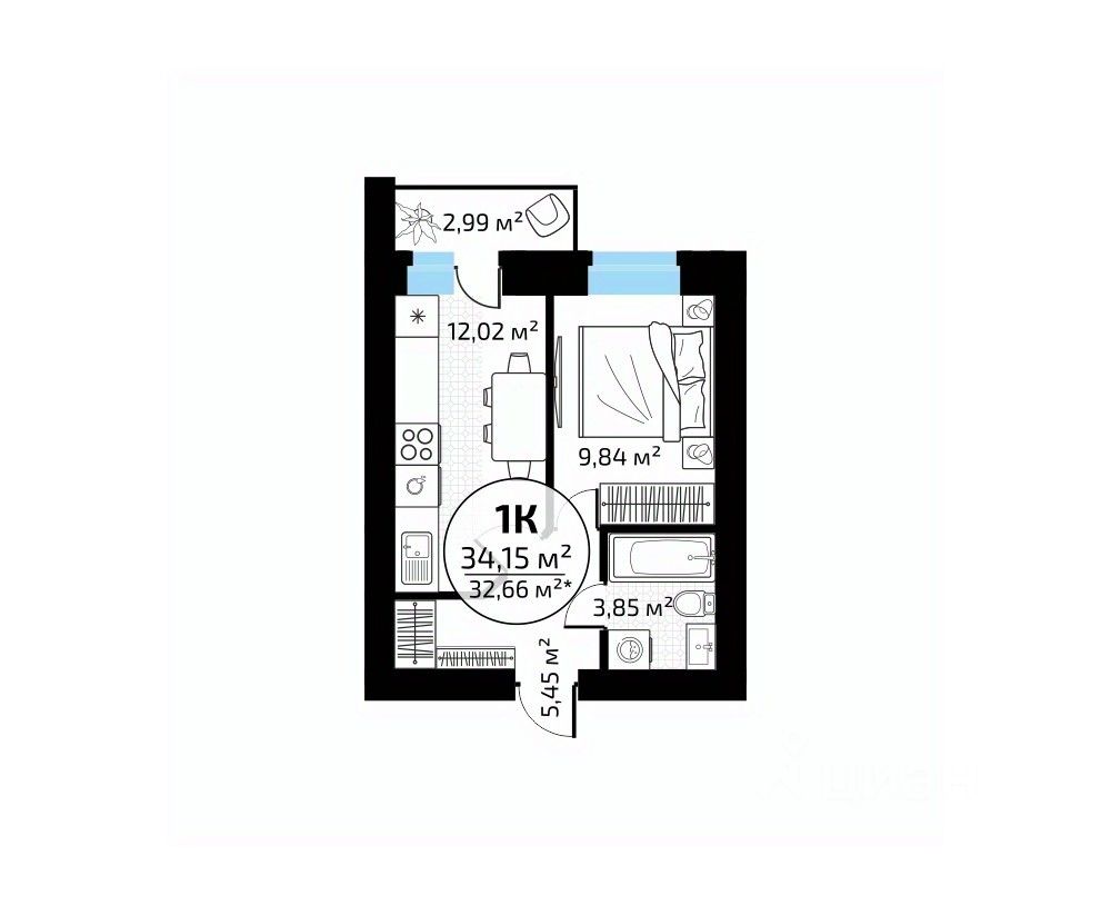 Общая площадь34,15 м²