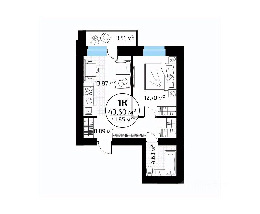 Общая площадь43,6 м²