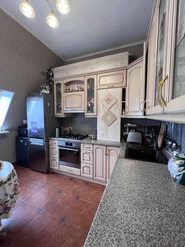 Сама квартира состоит из двух раздельных комнат 16.5 и 21.5 кВ.м. и просторной кухни 12.7 кВ.м. Санузел совмещенный. Имеется вместительная кладовая в квартире , а также кладовка на этаже. Полумансардное расположение создает особый уют и индивидуальность квартире, а высокие потолки 3м добавляют простора и света.