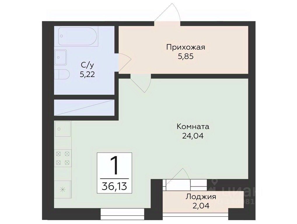 В продаже квартира площадью 36.13 кв. м без отделки. Квартира находится в жилом комплексе "Юность", на 11 этаже 24 этажного дома. Застройщик - ГК "Развитие".