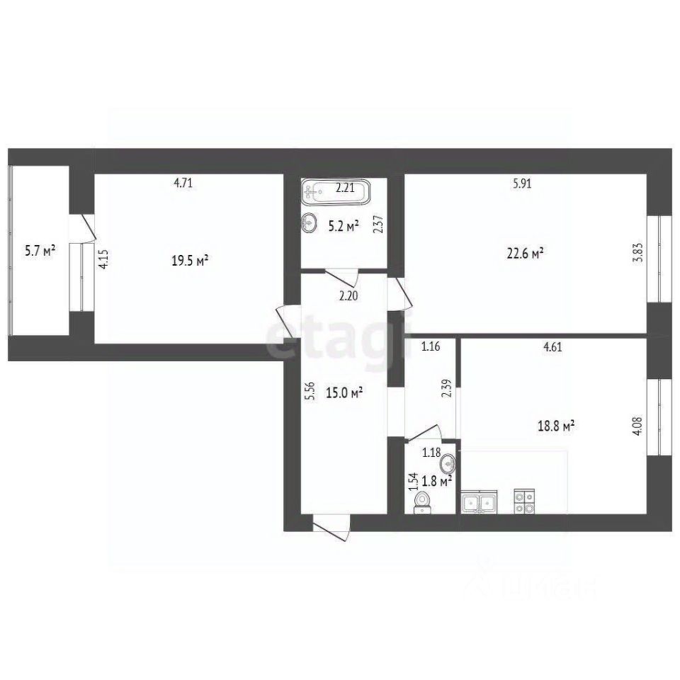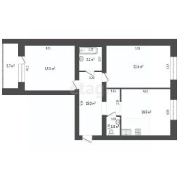 Вас ждет большая кухня-гостиная площадью 18,8 квадратных метров, где можно собираться с семьей и друзьями, готовить вкусные блюда и наслаждаться общением. Две просторные комнаты площадью 22,6 и 19,5 квадратных метров подарят вам возможность создать комфортные спальни или рабочие зоны по вашему вкусу.