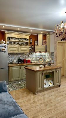 • Просторная кухня-гостиная (24,2 м²) сердце вашего дома! Здесь хватит места для большой семьи и шумных компаний. Зона кухни оборудована стильным гарнитуром со встроенной техникой и удобным островом с духовым шкафом. Зона гостиной располагает к приятному времяпровождению: большой обеденный стол, изысканные стулья, хрустальная люстра (Чехия) и уютный диван для семейных вечеров.