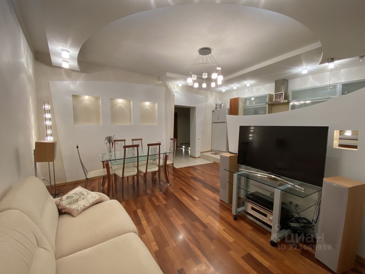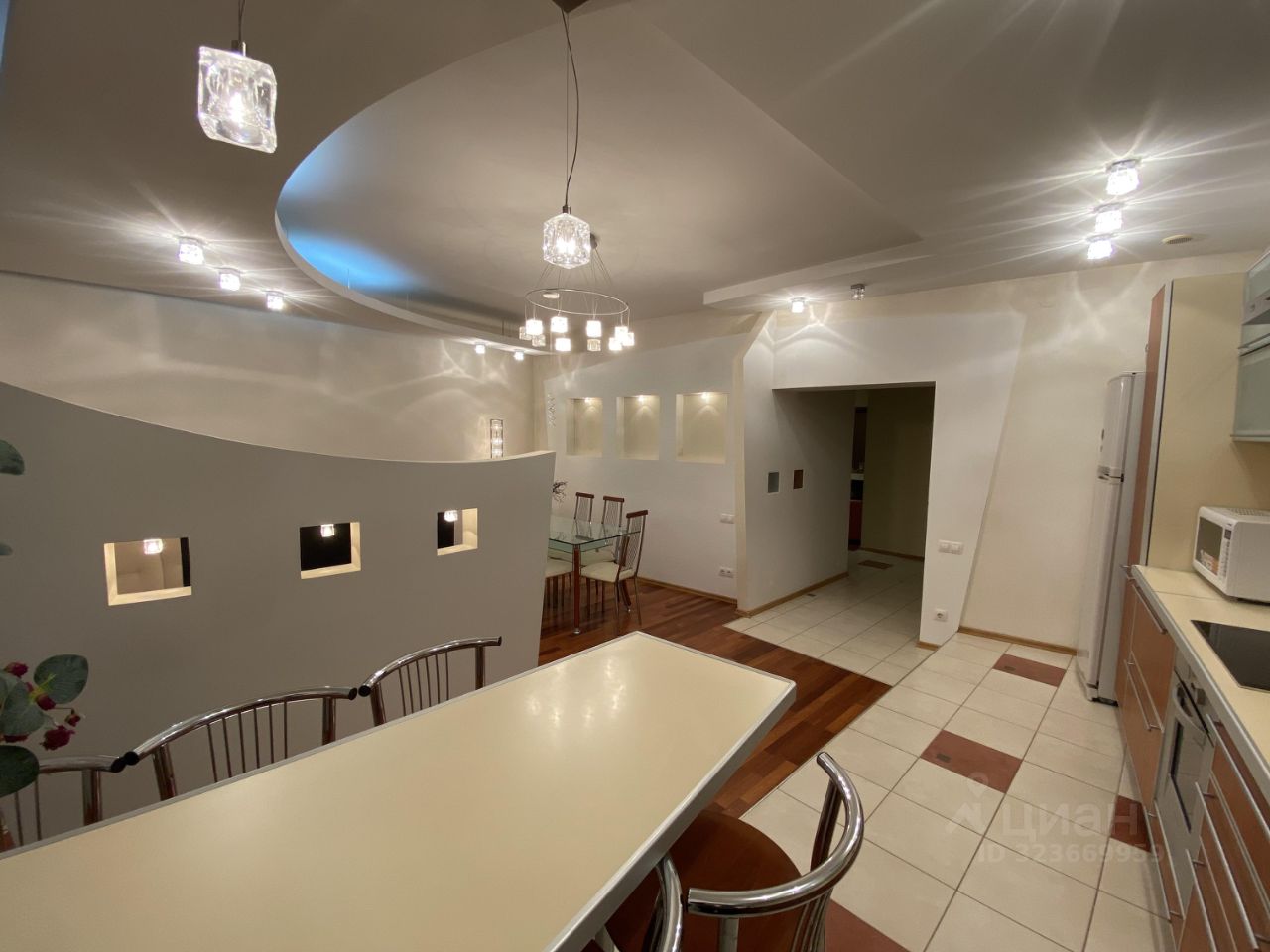 Кухня-гостиная, 30кв.м., укомплектована необходимой мебелью и техникой, очень светлая за счет многоуровневого освещения; также имеет свою лоджию.