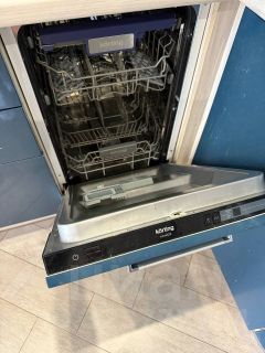 Полностью оборудованная кухня: духовой шкаф, микроволновка, холодильник, посудомойка.