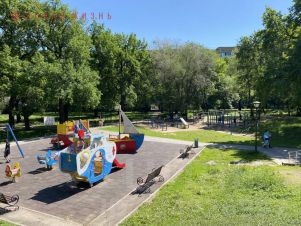 Расположен у озера с утками, с великолепным сквером для прогулок, с детскими и спортивными площадками.