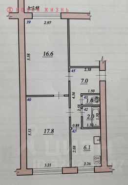 Общая площадь 50.5м2, жилая 34.4м2.