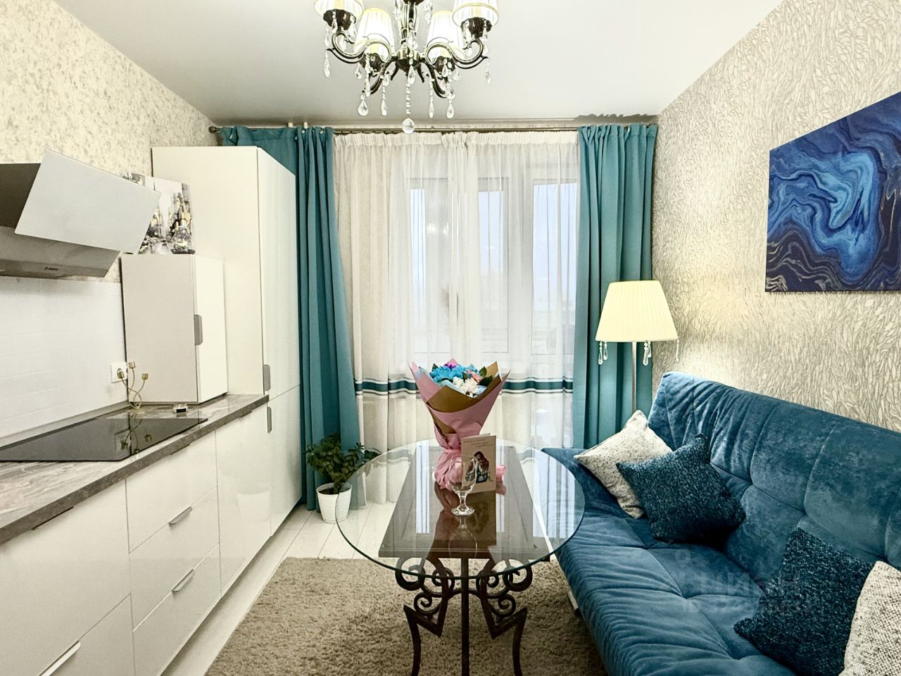 На кухне установлен дорогой кухонный гарнитур в идеальном состоянии. Вся встроенная техника остается новому покупателю. А именно: духовой шкаф, вытяжка, варочная панель, встроенный холодильник, не создающий лишнего визуального шума. Также по согласованию можем оставить удобный стильный диван в благородном синем оттенке, создающий полную гармонию со светлым интерьером кухни.