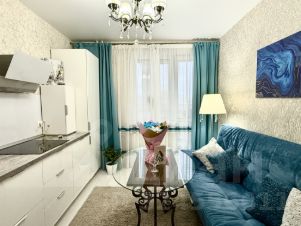 Теплая, уютная, однокомнатная квартира с очень удобной планировкой. Выполнен стильный евро-ремонт, напольное покрытие в санузле и на лоджии из керамогранита, в комнатах - качественный нейтрального цвета ламинат. Комната оборудована всей необходимой мебелью: просторная двуспальная кровать с подъемным механизмом, гардеробный шкаф, также остаются шторы.