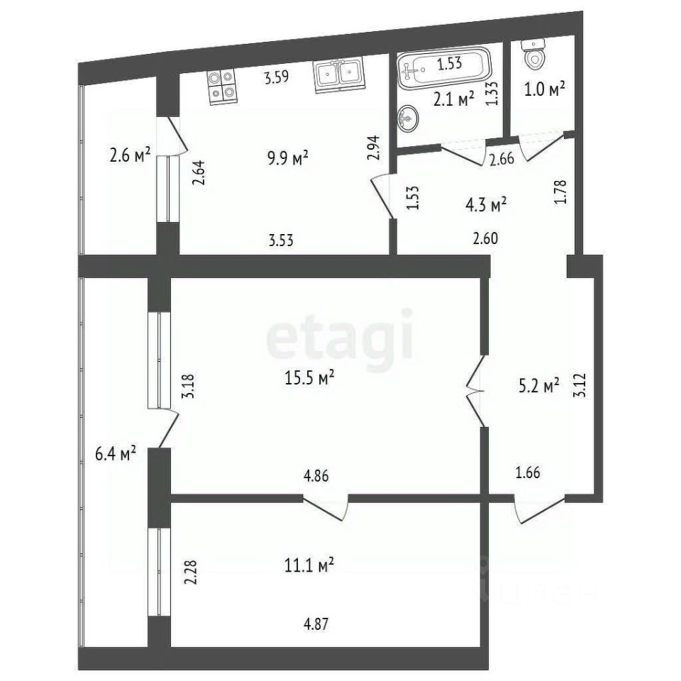 Возможность расширить санузел, так же убрав перегородку, по необходимости. В квартире 2 лоджии, выход на одну из кухни, на вторую из большой комнаты.