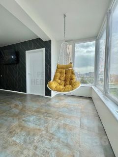 Балкон утеплён, смонтирован теплый пол, к потолку подвешено декор кресло-качалка.