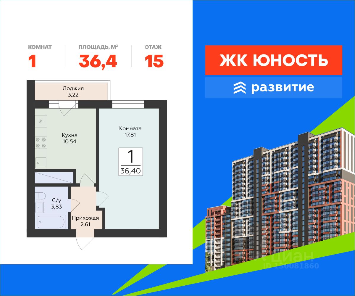 В продаже квартира площадью 36.40 кв. м с черновой отделкой. Квартира находится в жилом комплексе "Юность", на 15 этаже 24 этажного дома. Застройщик - федеральный застройщик ГК "Развитие".