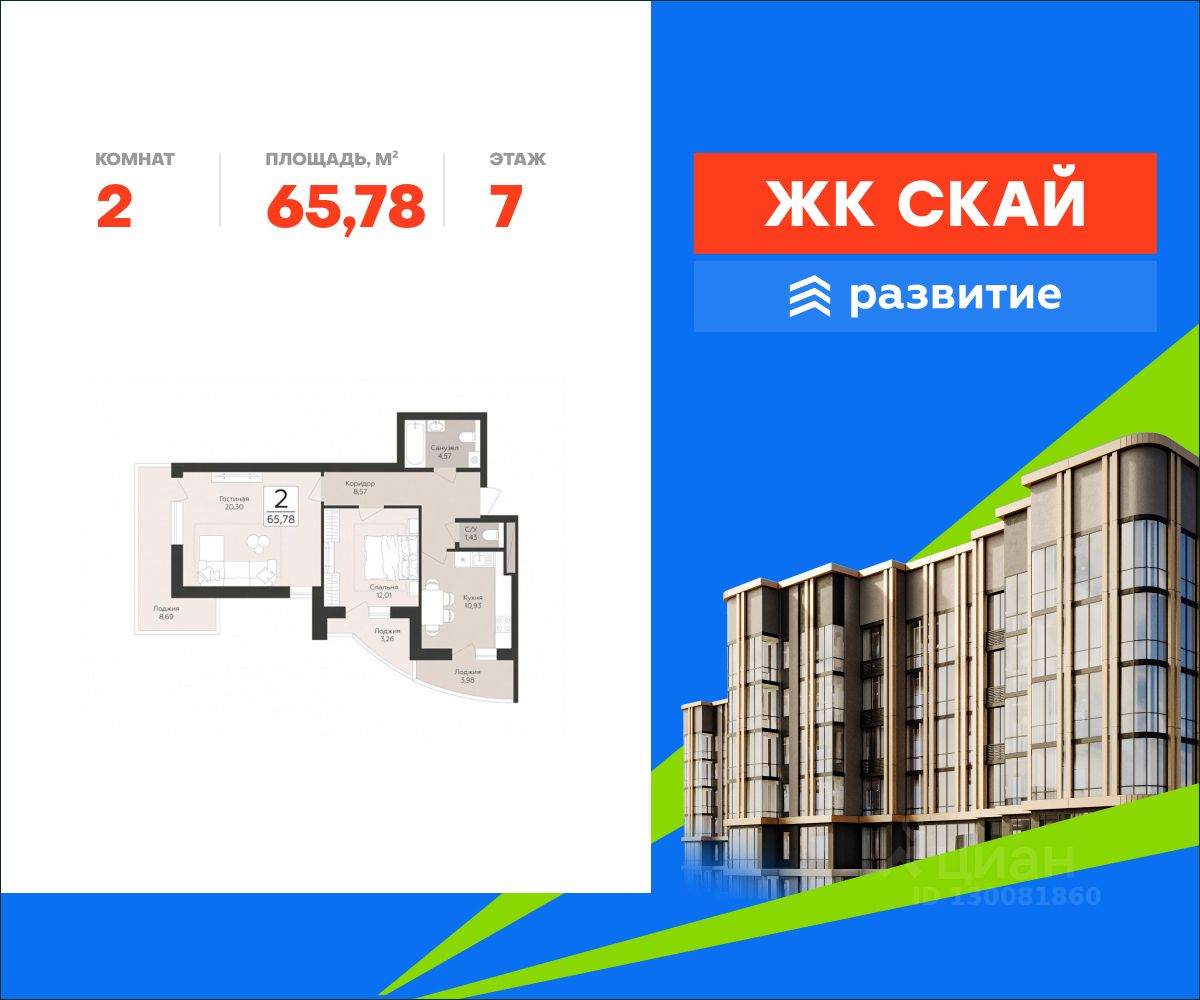 На пересечении улиц Антонова-Овсеенко и Советской Армии продается квартира площадью 65.78 кв. м с черновой отделкой. Квартира находится на 7 этаже 17 этажного дома, в жилом комплексе комфорт-класса "Скай". Застройщик - ГК "Развитие".