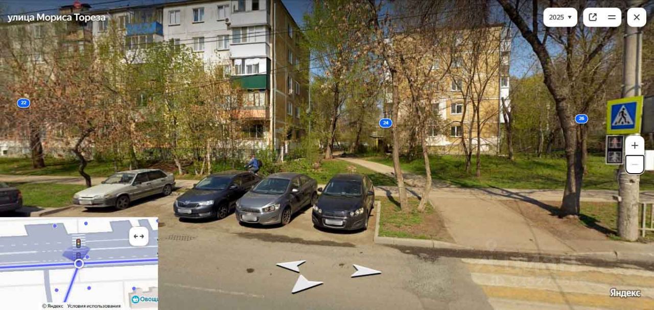На углу дома расположен вызывной светофор для пешеходов и перпендикулярная парковка.