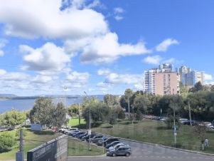 утренняя Волга, корабли и небо до горизонта. Вечером — закат над рекой и огни города.