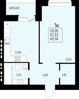 1-комн. квартира, 49,58 м²