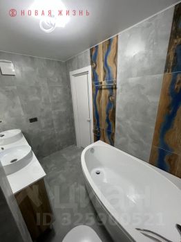 Cанузел совмещенный, пол и стeны - плиткa, в нём расположена двойная раковина, ванная-джакузи и сам унитаз.