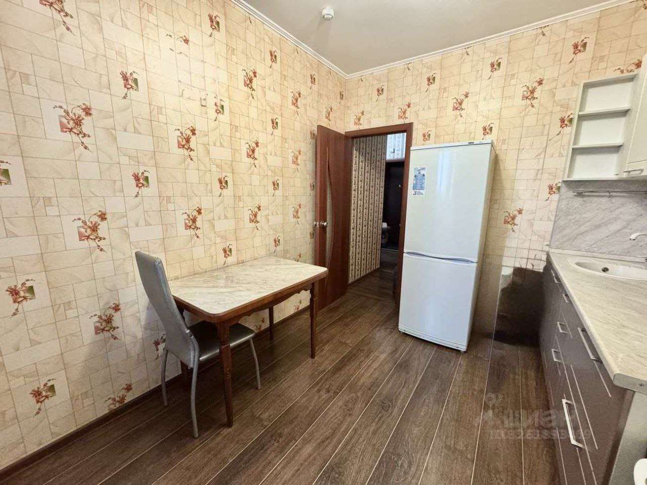 Для новых собственников останется встроенная кухня и бытовая техника, включая холодильник и обеденный стол.