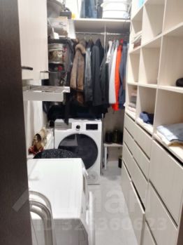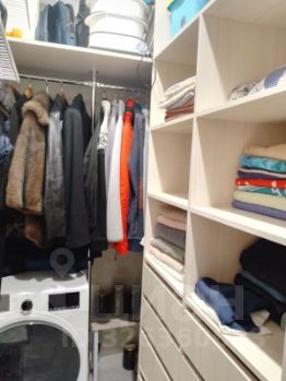 Вместительная гардеробная в которой помимо пространства для хранения размещаются стиральная и сушильная машины.