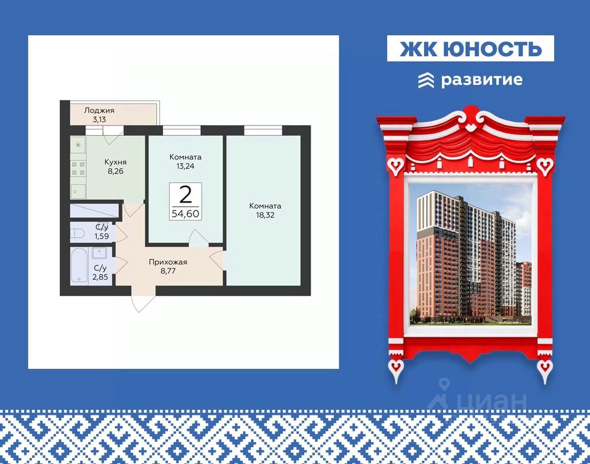 Продается 2-комнатная квартира 54,6 кв.м. на 7 этаже. ЖК "Юность" — комфортный ритм города, рядом с природой