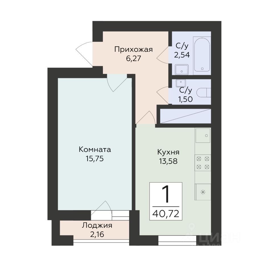 Общая площадь40,72 м²