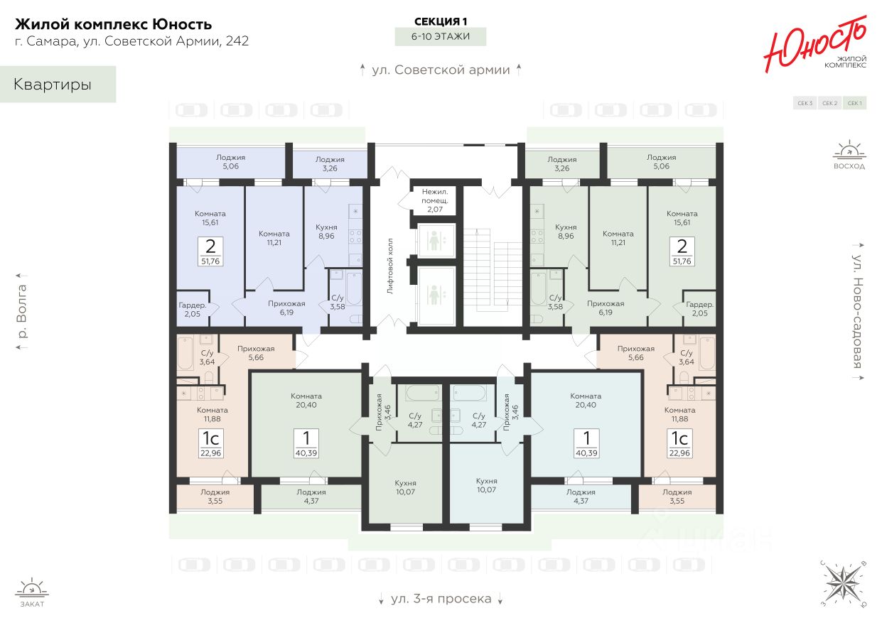ЖК "Юность" — комфортный ритм города, рядом с природой Жилой комплекс "Юность" создан для тех, кто ценит городскую динамику, продуманное пространство и возможность отдыхать на природе без длительных поездок. Это современное и стильное место для жизни, где каждая деталь работает на комфорт — от архитектуры до расположения. Планировки на любой этап жизни Комплекс предлагает разнообразие решений для разных потребностей: - Удобные студии — для тех, кто ценит компактность и функциональность - Классические однокомнатные квартиры — идеальны для молодых пар - Просторные двух- и трёхкомнатные варианты с раздельными санузлами — для семей с детьми Современная архитектура и качество строительства Здания выполнены по монолитной технологии. Контрастные фасады, панорамные лоджии и качественные отделочные материалы формируют выразительный и уютный облик. Архитектура комплекса гармонирует с городским ландшафтом, создавая ощущение уюта снаружи и внутри. Двор — для детей, спорта и отдыха Закрытая территория комплекса организована как многофункциональное пространство. Здесь есть: - Игровые площадки на безопасном покрытии - Зоны отдыха для взрослых - Пространства для активностей и спорта Локация — всё под рукой, и природа рядом Комплекс расположен вблизи Волги и зелёных городских парков. Всего 15 минут пешком — и вы на берегу реки. В шаговой доступности также: МТЛ Арена — 2 мин Школа 46 — 4 мин Городская больница 5 — 10 мин Пляж и Центральный парк — 1520 мин На автомобиле: До автовокзала — 15 мин До центра — 20 мин До ж/д вокзала — 30 мин Всё для жизни — на первых этажах В собственном ритейл-пространстве комплекса будут располагаться супермаркеты, пекарни, кофейни и пункты выдачи заказов. Повседневные задачи решаются, не выходя за пределы двора. Безопасность и парковка Для вашего удобства предусмотрены: - Подземный паркинг по стилобатной системе - Наземная парковка для гостей - Круглосуточное видеонаблюдение по периметру комплекса ЖК "Юность" — место, где городская жизнь сочетается с тишиной природы, а каждое утро начинается с комфорта.