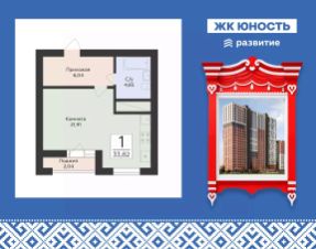 Продается 1-комнатная квартира 33,82 кв.м. на 1 этаже. ЖК "Юность" — комфортный ритм города, рядом с природой