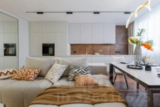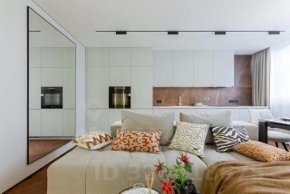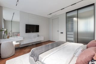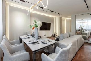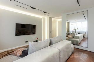 Потолки из гипсокартона с теневым профилем, по всему периметру, встроенные магнитные треки и светильники Maytoni, управлять которыми можно через умный дом и Алису.