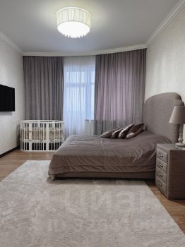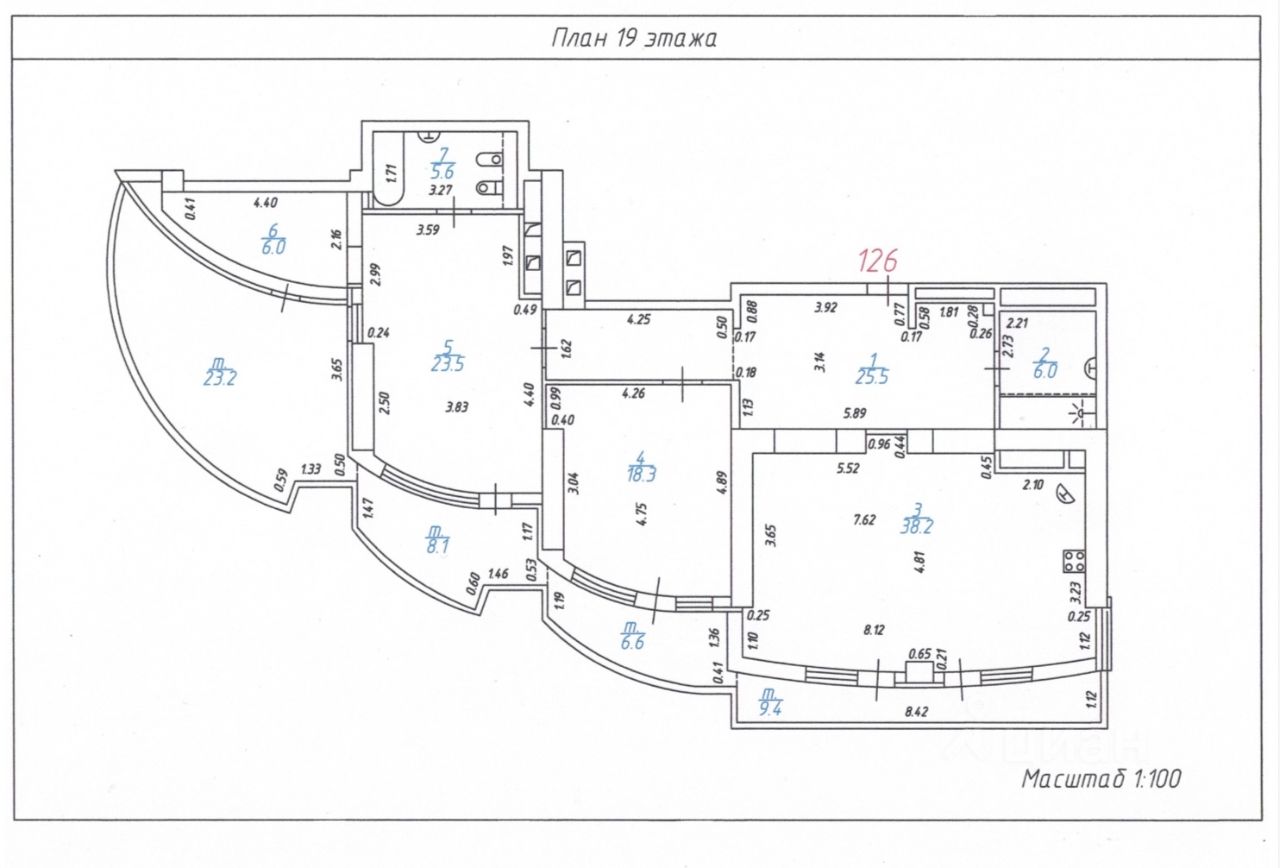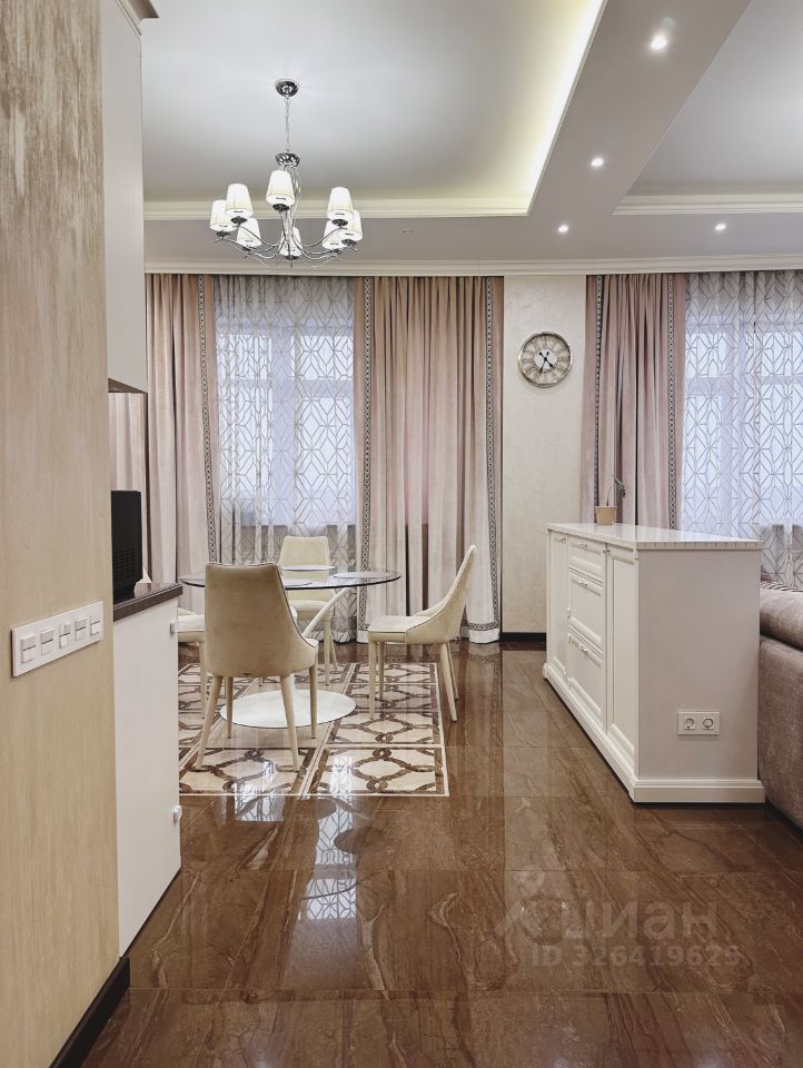Квартира площадью расположена на 19 этаже. Кухня и гостиная объединены, а спальни выделены в отдельные комнаты.